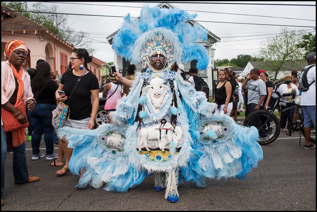Through the many fabrics, beads, feathers, and keepsakes, Rukiya shares the wisdom of a thriving creative and New Orleanian who has been married twice, raised two children, and studied beading abroad. In the artist’s words, “I create from experiences that we are going through here in America. My biggest pleasure is the expression of our cultural rituals. My white buffalo suit is about peace. I’m that big queen that rides the white buffalo. People mask for all kinds of reasons, but when I put on my suit, I am honoring my ancestors and reaching out to touch people’s spirits. When I mask, I am really taking the mask off; I am an American Chahta Indian.”